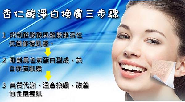 3.剛開始使用杏仁酸治療時,會出現青春痘、粉刺增多的現象,這是因為杏仁酸去除皮膚表面老化的角質,把毛孔內的粉刺、痘痘排擠出來,屬於正常現象。