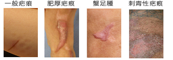 4蟹足腫:因為疤痕的形狀如螃蟹的肢體,且成咖啡色、疤痕會向四周正常的