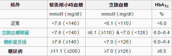 美國糖尿病協會(ADA)2010年的推薦標準,滿足以下任何一條即可診斷為糖尿病: