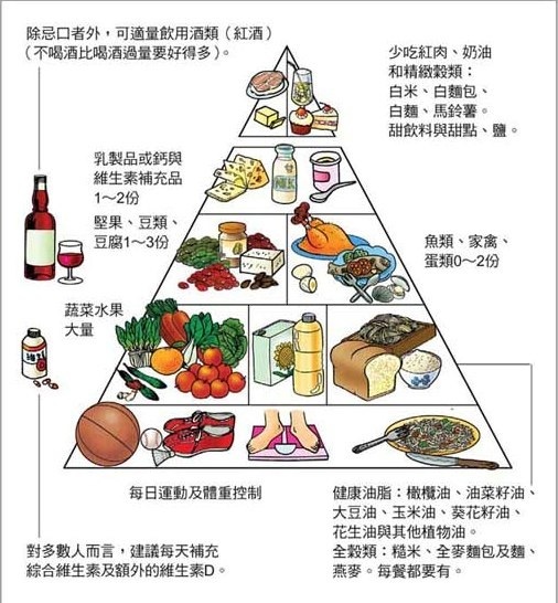 水果可以做成乾果、或冷凍、或罐裝;但不要祗喝水果汁,因為水果汁裏沒有纖維素。每天吃水果,可以減少低密度膽固醇及避免血管硬化。