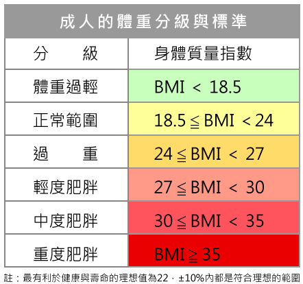 但因東方體型上之差異,我國衛生署建議之標準如下:
