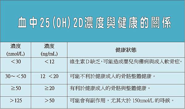 25(OH)D 在體內的半衰期有三個禮拜,是穩定的供給指標。所以目前評估一個人的維生素 D 是否足夠,是檢測血中的 25(OH)D 濃度。現在美國和台灣的骨鬆治療,建議血中 25(OH)D 的濃度,要在 30 ng/ml 以上。